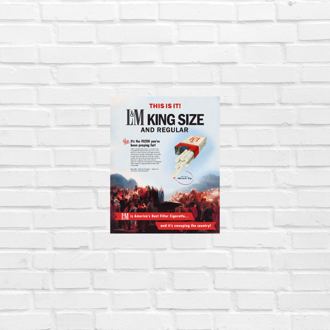 Deciding on a religious painting was rather obvious given the “Miracle Tip” slogan and campaign. I changed the slogan to be more religious than the original “just what the doctor ordered” phrase as it helps further communicate that the L&M filter is the answer to health-conscious smokers.